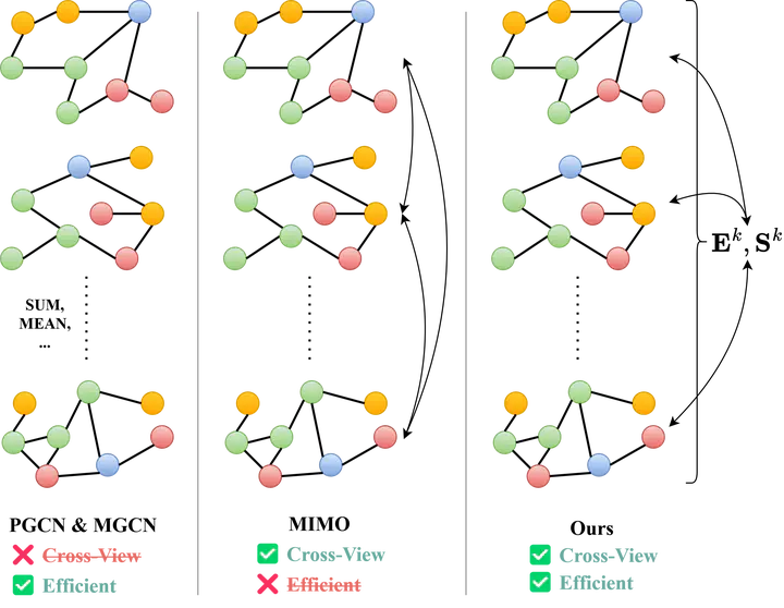 Comparison of SMGCN and other multigraph convolution methodsExisting multigraph convolution methods either ignore the cross-view interaction among multiple graphs, or induce extremely high computational cost due to standard cross-view polynomial operators. To alleviate this problem, this paper proposes a Simple MultiGraph Convolution Networks (SMGCN) which first extracts consistent cross-view topology from multigraphs including edge-level and subgraph-level topology, then performs polynomial expansion based on raw multigraphs and consistent topologies. In theory, SMGCN utilizes the consistent topologies in polynomial expansion rather than standard cross-view polynomial expansion, which performs credible cross-view spatial message-passing, follows the spectral convolution paradigm, and effectively reduces the complexity of standard polynomial expansion. In the simulations, experimental results demonstrate that SMGCN achieves state-of-the-art performance on ACM and DBLP multigraph benchmark datasets. Our codes are available at https://github.com/frinkleko/SMGCN